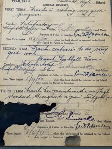 Being sent to the Ballarat High School in 1950 came as a very pleasant surprise for just a handful of us. My older brothers had already gone to grade 7 and 8 in the little school on the Orphanage site, which was the usual training ground before being sent out to work. High school gave us lucky ones a taste of normality, although lining up for the free books after all the other children had brought along cash to pay for theirs was demeaning. I did well at high school, but was a bit of an attention seeker. I had to carry back to Superintendent Morton a report about my bad behaviour. I literally blotted my copy book thinking I could cover up.